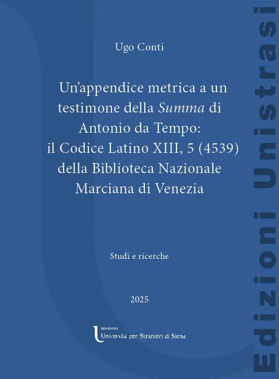 Un’appendice metrica a un testimone della Summa di Antonio da Tempo: il Codice Latino XIII, 5 (4539) della Biblioteca Nazionale Marciana di Venezia, a cura di Ugo Conti, Siena, Edizioni Università per Stranieri di Siena (ISBN: 978-88-32244-25-0; collana "Studi e ricerche" 22; volume pubblicato il 30/10/2025)
